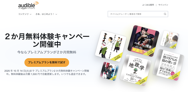 内容: キャンペーン用ページからお申込みいただくと、オーディオブック・ポッドキャスト・オリジナル作品など数十万以上の対象作品が聴き放題になる「Audibleプレミアムプラン」がお申込日から2か月間無料で体験いただけます。