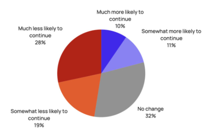 より具体的な質問で、ポッドキャスト利用者の間では、回答は明らかに分かれています。21%がポッドキャストを継続する可能性が非常に高い、またはやや高いと回答した一方で、47%は可能性が低いと回答し、28%は大幅に低いと回答しました。