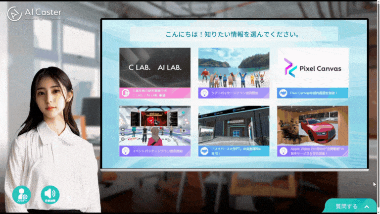 「AI Caster」は、生成AI技術を融合した次世代型情報発信サービス。企業の広報・プロモーション活動の支援をはじめ、業務効率化や教育分野など幅広いシーンで活用可能です。PR・IR動画、マニュアル解説、社内研修、FAQ対応など、さまざまな情報を誰でも手軽に映像化できるツールです。