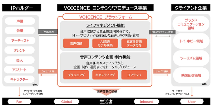 同事業の名称「VOICENCE」は、声=Voiceに、権利を示すLicense(ライセンス)と価値のEssence(本質)を重ね合わせた造語という。