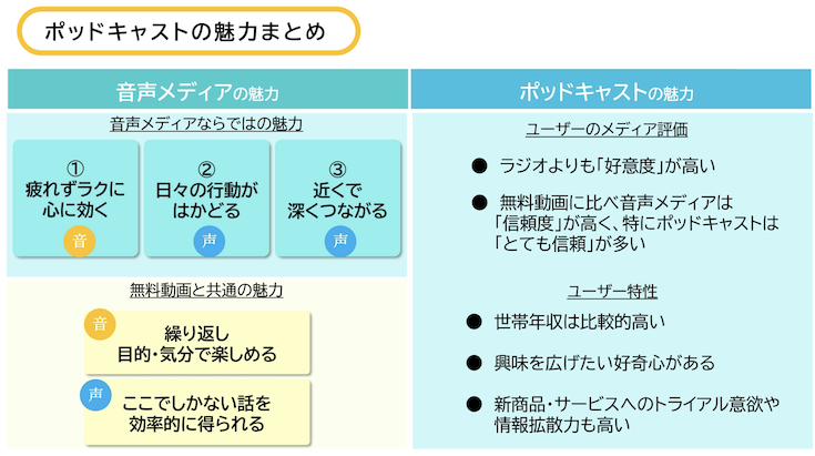 今回の調査から、音声メディアは従来のラジオの延長にとどまらず、生活の隙間時間を埋め、利用者の気分に寄り添う存在として定着しつつあることが浮き彫りとなった。