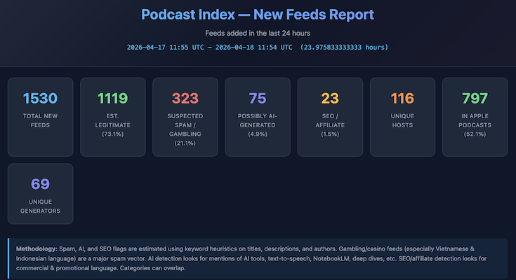 Podcast Indexが公開した直近24時間の新規フィード登録レポートから、1,530件の新規登録のうち約27%がスパムやAI生成など問題のあるフィードであることが判明。業界の成長と課題を深掘りします。